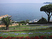 ホテルのレストランは、松とヤシの木越しに海を眺められ、庭の下の方はプライベートビーチになっています。
