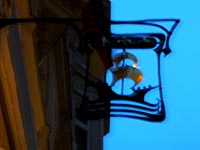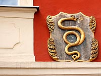ガイドブックによると、紋章のほかに動物や宗教的なものも多い。マリア像や聖人、赤い羊、黄金の鍵、三本のバイオリン、二つの太陽など。まだ住所というものがなかった時代、これらのレリーフが家の識別に使われていた、とあります。